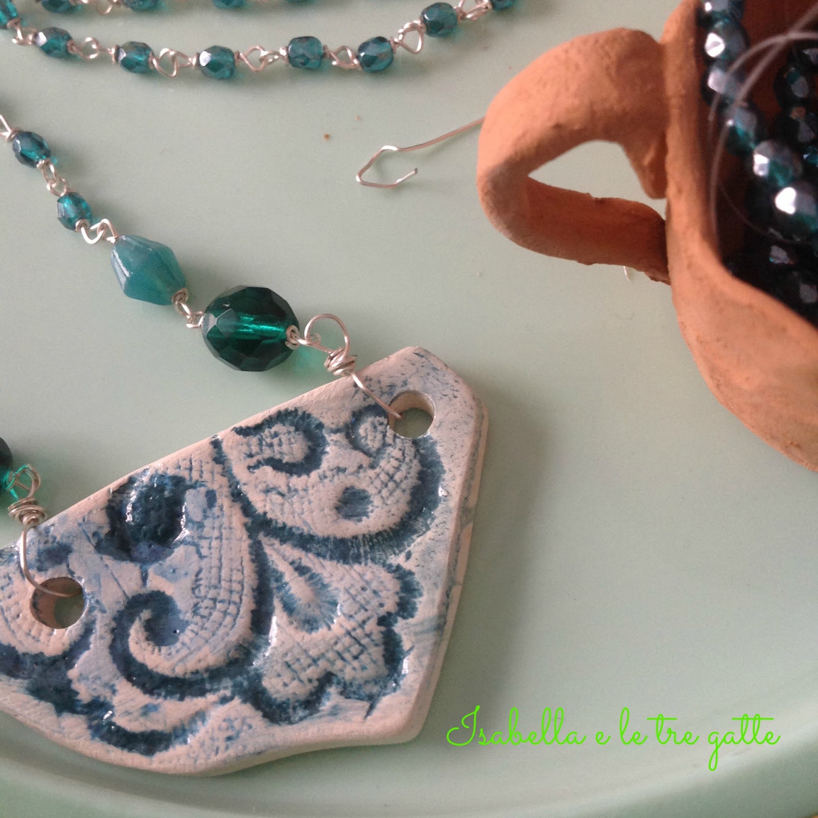 Al primo dei due ciondoli ho creato una collana con mezzi cristalli color petrolio...